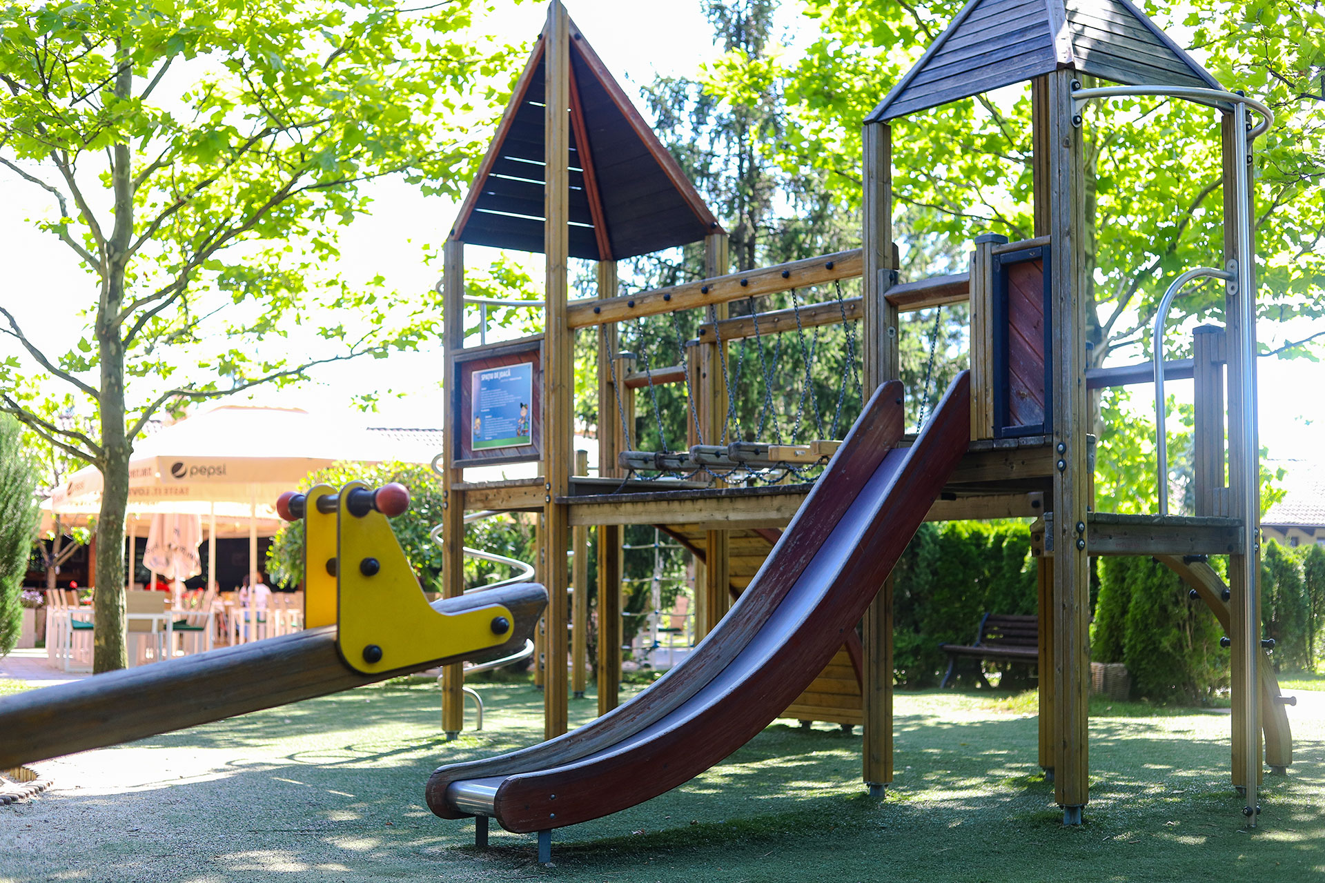 - parc de joacă – copiii își pot dezvolta abilitățile motorii în zona cu tobogan, zonă de cățărat, balansoar, leagăne etc